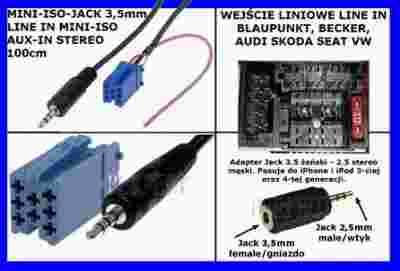 Przedmiot nowy od polskiego producenta. Markowa kostką MINI ISO i kabel zakończony wtyczką MINI JACK 3,5mm. Pasuje do większości odtwarzaczy mp3 itp. Dokładamy do kompletu przelotkę z mini jack 3,5mm na mini jack 2,5mm. Za pomocą tych wtyczek da się podłączyć wszystko co gra łącznie z małymi telefonami, odtwarzaczami mp4, iPhonem itd. FULL-OPCJA.