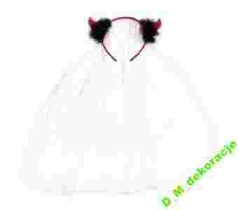 Biały welon z czerwonymi różkami obszytymi czarnym futerkiem.