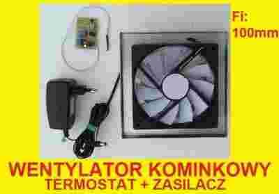 W komplecie jest zasilacz 12V oraz termostat elektroniczny który włacza automatycznie wentylator gdy temperatura doprowadzonego z kominka powietrza wzrosnie do temperatury załączenia (około 30 st C) i wyłącza gdy spadnie kilka stopni poniżej temperatury załaczenia. Oczywiscie z uwagi na tolerancje elementów temperatura właczenia/wyłaczenia w poszczególnych egzemplarzach może się róznic o kilka stopni C.