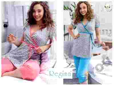 Piękna piżama dla pań firmy Regina. Stworzona została z myślą o kobietach karmiących, zapewniając im nie tylko komfort, ale również fantastyczny wygląd. Koszulka w drobne kwiatki, z krótkim rękawem, wiązana i regulowana pod biustem. Zszyta tak, by dostęp do piersi w okresie karmienia maluszka był łatwy i bezproblemowy. Spodenki gładkie, w długości 3/4. W pasie posiadają nieuciskającą gumkę. Całość wykonana z wysokogatunkowej, 100% bawełny.