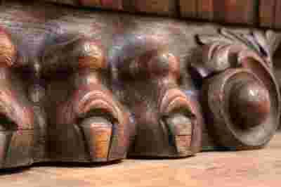 Prosty, wysunięty gzyms podkreślony został misternie rzeźbionym fryzem.