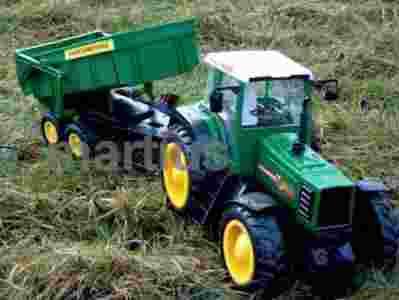 Gdy przyczepa jest niepotrzebna można ją oczywiście odpiąć. Traktor zaopatrzony jest w ogromne 13,5 cm tylne koła i również nie małe 11,5 cm przednie. Przyczepa natomiast jest zawieszona na dwuosiowym podwoziu wyposażonym w 7 cm koła. Traktor zasilany jest dołączonym akumulatorem co wydatnie obniża koszty eksploatacji.
