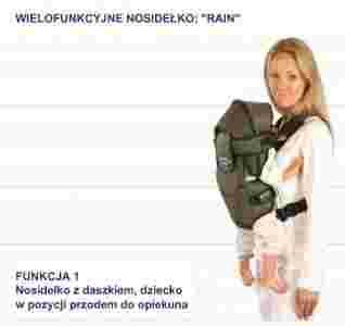 Dla mamy najważniejsze jest bezpieczeństwo, dla dziecka – wygoda. Odpowiedzią na te potrzeby jest nasze nosidełko RAIN. Starannie zaprojektowane, umożliwiające noszenie maluszka na kilka sposobów. Nosidełko dostosowuje się do potrzeb dziecka na różnych etapach jego rozwoju. Specjalny, odpinany daszek i usztywniane oparcie ochraniają główkę przed niekontrolowanym przechyleniem oraz przed nieprzyjemnymi bodźcami z zewnątrz. Dzięki możliwości noszenia maluszka w pozycji bocznej leżącej pozwala na wygodne i dyskretne karmienie piersią. Odpięcie daszka umożliwi maluchowi poznawanie otoczenia.