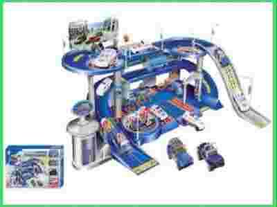 Zabawkowy wielopoziomowy parking policyjny + 4 samochody.