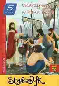 Czas szybko biegnie, dlatego po wakacyjnym odpoczynku spotykamy się już w piątej klasie. Będziemy poznawali nowe wiadomości o otaczającym nas świecie, zdobywali nowe umiejętności i poprawiali sprawność fizyczną. Będziemy też pogłębiali swoją wiarę i wiedzę religijną. W tym roku pomocą w nauce religii będzie dla nas podręcznik zatytułowany "Wierzymy w Pana Boga". Chcemy na początku zobaczyć, co się w nim znajduje. Kiedy spojrzymy na okładkę, widzimy tam Pana Jezusa, który powołuje pierwszych Apostołów nad Jeziorem Galilejskim- Piotra, Jana i Andrzeja. Ta scena przenosi nas do Ziemi Świętej, gdzie miały miejsce wydarzenia, opisane w Biblii. W klasie piątej będziemy je poznawali dokładniej. Poznamy też życie i działalność Pana Jezusa, kilka Jego przypowieści i dowiemy się, w jaki sposób uwalnia nas od grzechu, umacnia naszą wiarę oraz powołuje do świętości. Przekonamy się też, że "wierzyć w Pana Boga" to znaczy żyć według Jego "konstytucji", czyli dziesięciu przykazań i ośmiu błogosławieństw. To właśnie Pan Bóg pomaga nam dobrze żyć i tak kształtować nasze sumienie, by ono podpowiadało nam, co jest naprawdę dobre. Po raz kolejny spotkamy się także z Lolkiem, czyli młodym Karolem Wojtyłą. (...)