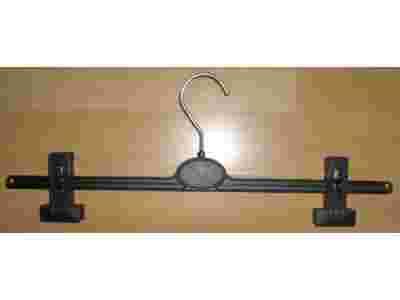 Wieszak wykonany jest z tworzywa sztucznego w kolorze czarnym, oraz posiada metalowy haczyk. Ekspozytor posiada przesuwane klamry (o szerokości ok. 4cm) umożliwiające regulację ich rozstawu wg. potrzeb i zawieszenie prezentowanych ubrań. Maksymalny rozstaw klamer wynosi ok. 40cm, a minimalny ok. 10cm. Klamry posiadają wkładki anty-poślizgowe, dzięki którym odzież "sama" się z nich nie "wyślizguje". Oba końce wieszaka umożliwiają dodatkowo zawieszenie prezentowanej odzieży za haczyki-wieszaki wszyte do ubrań.