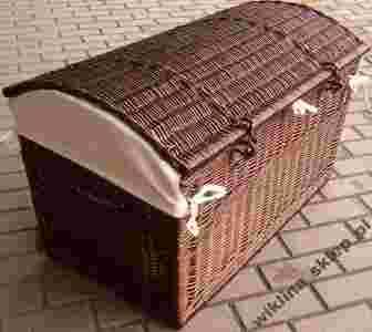 Przedmiotem aukcji jest kufer - skrzynia, wyrób bejcowany i lakierowany.Kufer posiada wewnątrz obszycie bawełniane, wieko kosza na drucianych zawiasach.