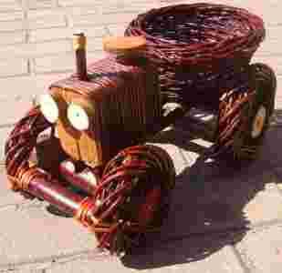 Przedmiotem aukcji jest kwietnik traktor wykonany z wikliny.