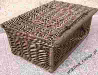 Przedmiotem aukcji jest wiklinowa walizka, nie jest obszyta wewnątrz materiałem, klapa mocowana na drucianych zawiasach.