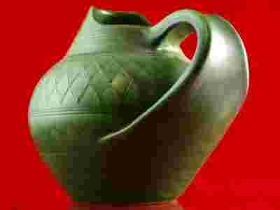 interesujący wazon ceramiczny, pochodzący z lat 50.XX wieku-sygnowany WK/Wilhelm Kagel-malarz,producent ceramiki/dekor:Henkel Willi. Obiekt ozdobiony został efektownym,bogatym motywem dekoracyjnym-geometrycznym z pięknie wymodelowanym uszkiem i wylewem.Uwagę zwraca ciekawa,nasycona barwa szkliwa.