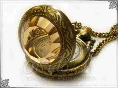 Oryginalny zegarek na łańcuszku, wykonany z perfekcją i dbałością o każdy detal. Solidna metalowa koperta zegarka na froncie ma kryształowe okienko o barwie miodowej, przez którą widoczny jest biały cyferblat.