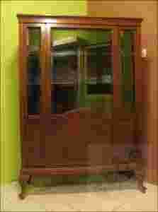 Mahoniowa witryna / biblioteczka z okresu powojennego na giętych nogach. Mebel wykonany z pełnego drzewa fornirowany mahoniem. Półki z profilowanym felcem, barwionym na czarny kolor. Szyby fazowane.
