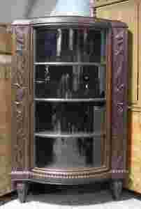 Dębowa, narożna witryna. Drzwiczki oraz szyba łukowato wygięte, nogi w kształcie odwróconych stożków. Boki mebla zdobione snycerskimi ornamentami.