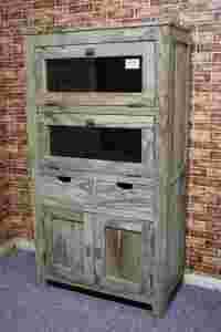 Witryna jest nowa, sprzedawana w II gatunku. Wykonana z Indyjskiego drewna. Każdy mebel jest unikalny, ze względu na ręczną produkcję oraz gatunek drewna. Wyróżnia się kolorystyką oraz strukturą drzewa (małe pęknięcia, dziurki, delikatne wgłębienia, które są wykonywane celowo), podkreśla to indywidualność mebla.