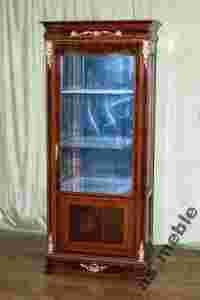 Mebelek jest nowy , wykonany współcześnie z pełną precyzją z zachowaniem starego stylu i wzornictwa.Cała z drzewa w kolorze ciemnego orzecha . Zachwyca wytwornością i szykownością . Zabudowana do samego dołu .Górna część z trzech stron przeszklona, na dnie i plecach lustro , które daje efekt podwójności eksponowanych przedmiotów ( środek przedzielony dwiema , szklanymi pólkami ) !!! Po niżej znajduje się pojemna szafka.