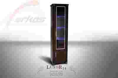 Element systemu LUXOR jest niepowtarzalny poprzez swój design , zaokrąglone krawędzie boczne , czy możliwość wyboru kolorystyki frontów . Witryna posiada oświetlenie LED w cenie . Oświetlenie do wyboru w kolorze czerwonym , niebieskim lub białym .