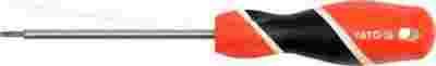 Wkrętak krzyżakowy typ TORX .Trzpień walcowy, wykonany ze stali o symbolu S2, utwardzany do około 58 HRC. Powierzchnia trzpienia satynowana, końcówka robocza utwardzana i piaskowana / wzmacnia to stabilność grota /. Rękojeść wykonana z odpowiednio dobranych tworzyw o różnych twardościach. Końcówka torx securiti posiada wewnętrzny otwór do obsługi gniazd zabezpieczonych