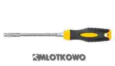 Wkrętak z giętkim grotem umożliwiający pracę nawet w trudno dostępnych miejscach grot wykonany ze stali chromowo-wanadowej . Użycie chromu gwarantuje odporność stali na korozję, utlenianie, ścieranie i dużą wytrzymałość w wysokiej temperaturze. Wanad natomiast hamuje wzrost ziaren podczas obróbki termicznej, zwiększając jednocześnie ciągliwość stali hartowanej. Końcówki z magnesem przyciągającym. Długość całkowita wkrętaka: 310 mm, końcówki 25 mm, długość robocza 190 mm. W skład zestawu 12 elementowego wchodzi: uchwyt adapter do nasadek 1/4" końcówki płaskie: 5 mm, 6 mm, 7 mm końcówki krzyżowe pozidriv: PZ1, PZ2, PZ3 końcówki TORX: T10, T15, T20, T30 .