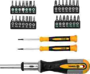 - Bardzo dobrej jakości zestaw zawierający wkrętaki, oraz bity marki Vorel.