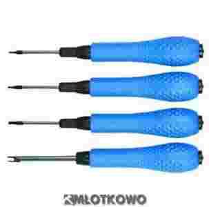 Komplet 4 specjalistycznych wkrętaków , do telefonów komórkowych i notebooków marki Top Tools. W skład zestawu wchodzą: 3 wkrętaki z końcówką torx i 1 wkrętak z końcówką specjalistyczną typu "ząb". Uchwyt z końcówką górną obrotową, końcówki wkrętaków magnetyczne. Wkrętaki wykonano ze stali chromo-wanadowej. Wkrętaki pasują do większości modeli telefonów: Ericsson, Motorola, Nokia, Sagem, Samsung, Sony Ericsson.