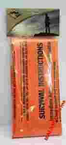 Posiada nadrukowane (w języku angielskim) instrukcje dotyczące postępowania w sytuacji zagrożenia życia, rozpalania ognia, budowy schronienia, itp.