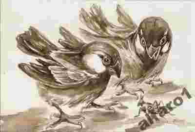 WRÓBELKI-AKWARELA W SEPII