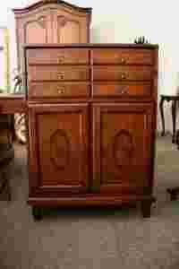Bardzo ładny i praktyczny sekretarzyk - komoda fornirowany orzechem. Blat i drzwi są pięknie intarsjowane. Blat komody obraca się o 180 stopni tworząc sekretarzyk - patrz zdjęcia. Szuflady wyściełane są jasnobrązowym pluszem.