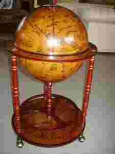 Kapitalny barek w formie obrotowego, starego globusa. Trzy toczone nogi zakończone są łożyskowanymi kółkami pozwalającymi na swobodne przesuwanie mebla. Wewnątrz otwieranej kuli znajduje się miejsce na butelki i kieliszki. Globus ozdobiony jest mapą dawnego świata. Globus ozdobiony jest mapą dawnego świata. UWAGA ! Na zdjęciach barek jest nieco jaśniejszy niż w rzeczywistości - efekt lampy błyskowej.
