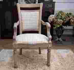 Powierzchnia celowo postarzana poprzez nierówne pokrycie farbą i zamierzone ślady użytkowania, przez co mebel nabiera starego charakteru., dekoracyjna snycerka. Siedzisko i oparcie pokryte tkaniną w kratkę biało-beżową.