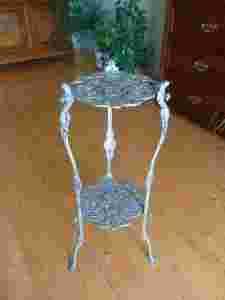 Przedmiotem licytacji jest bardzo ładny , zabytkowy kwietnik . Przedmiot pochodzi z początku ubiegłego wieku ( ok. 1900 r). Mebelek wykonano w stylu secesji . Posiada on cechy charakterystyczne dla początków tego stylu w sztuce . Kwietnik wykonano z metalu . Mebelek jest bardzo dekoracyjny . Na blacie i dolnej półce widać wspaniałe ażurowe wzory : bukiety kwiatów ( co jest charakterystyczne dla secesji ) . Kwietnik posiada ładnie wykonane nogi , których główną ozdobę stanowią główki aniołów i bardzo dekoracyjne śruby w formie kwiatków . Kwietnik prezentuje się doskonale . Dzięki ciekawej formie i rozmiarom kwietnik będzie pasował do wystroju wielu wnętrz . Stan zachowania przedmiotu : biorąc pod uwagę wiek przedmiotu , jego stan oceniam jako naprawdę dobry . Nie ma żadnych pęknięć czy ubytków metalu . Konstrukcja mebelka jest naprawdę solidna i stabilna . Widoczne są jedynie odpryski farby , co starałam się ukazać na zdjęciach . Ubytki farby nie rzucają się w oczy nie mniej istnieją . Kwietnik prezentuje się naprawdę wspaniale . Polecam .