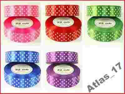 Witam! Na tej aukcji możesz kupić: TAŚMĘ SATYNOWĄ W KROPKI ( Wstążkę atłasową ) Szerokość: 25 mm Długość: 22 metry Do wyboru aż 5 kolorów. Waga jednej rolki to ok. 70 gramów. 1 sztuka = 1 rolka taśmy.