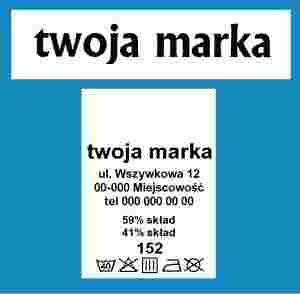 Na wszywkach wykonujemy dowolny nadruk w kolorze czarnym, zgodnie ze wzorem przesłanym przez kupującego (np. nazwa, logo producenta, przepis prania, kod kreskowy, skład surowcowy, rozmiar, kraj pochodzenia itp).