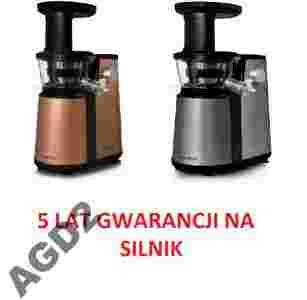 Dzięki wałkowi ślimakowemu o unikatowej konstrukcji, obracającemu się z prędkością 80 obrotów na minutę, produkty są miażdżone i wyciskane poprzez zbrojone pierścieniem wykonanym z żywic kompozytowych sito. Skuteczność działania wyciskarki wolnoobrotowej jest znacznie wyższa od tradycyjnych sokowirówek. Praca wyciskarki jest cicha, a czyszczenie bezproblemowe. Urządzenie o wyjątkowo wysokiej mocy 400W radzi sobie z większością warzyw i owoców, które wyciskane powoli nie tracą swoich wartości odżywczych. Silnik urządzenia posiada szereg zabezpieczeń, dzięki czemu objęty jest pięcioletnią gwarancją producenta. Wysoka jakość wykonania oraz wysokiej klasy wzornictwo dopełniają walorów urządzenia. Dostępny w dwóch kolorach.