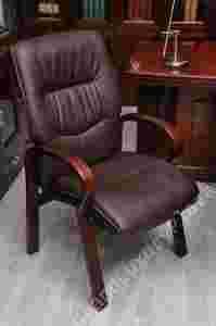 Profesjonalny drewniany fotel konferencyjny tapicerowany skórą ekologiczną w kolorze brązowym.