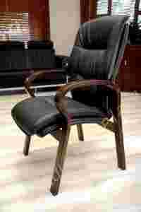 Profesjonalny drewniany fotel konferencyjny tapicerowany skórą ekologiczną w kolorze czarnym.