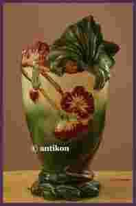 Duży, bardzo efektowny majolikowy wazon w stylu secesyjnym. Naczynie ma piękny, finezyjny kształt o miękkich, wręcz płynnych liniach i pokryte jest błyszczącym szkliwem w skontrastowanych barwach. Wazon ślicznie dekorują ręcznie malowane zdobienia w postaci fantastycznych kwiatów oraz liści.