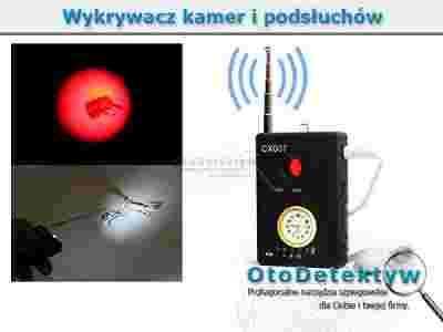 Profesjonalny, przenośny wykrywacz podsłuchów poradzi sobie z każdym rodzajem pluskwy, niezależnie od tego czy jest to podsłuch GSM, lokalizator GPS, kamera przewodowa/bezprzewodowa czy mikrosłuchawka bluetooth. Nowoczesna technologia umożliwia skanowanie wysokich częstotliwości 1 - 6500 MHz. Wykrywacz wyposażony jest w potencjometr czułości, który pozwala na wyeliminowanie zakłóceń i dokładną lokalizację podsłuchu. Informację o wykryciu pluskwy otrzymujemy za pomocą dźwięku - wbudowany głośnik/słuchawki oraz dokładnej czterostopniowej skali diodowej. Jako prawdopodobnie jedyny wykrywacz na rynku, nasz posiada możliwość wykrywania zwykłych kamer! Standardowo wykrywacze odnajdują tylko i wyłącznie urządzenia, które nadają lub odbierają fale, jednak model ETCX007 posiada wbudowane diody refleksyjne oraz specjalny wizjer. Światło odbija się od obiektywu kamery dzięki czemu powstaje odblask, umożliwiający wykrycie niepożądanego rejestratora. Dodatkowym atutem jest wbudowany akumulator. Wystarczy podłączyć urządzenie do ładowania i możemy cieszyć się bezproblemowym działaniem bez konieczności ciągłej wymiany baterii.