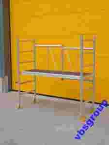 Kompaktowe, poręczne ruchome rusztowanie modułowe. Idealna pomoc w domu, biurze, garażu i firmie. Zajmuje niewiele miejsca w transporcie i w trakcie składowania max. wysokość 186cm, szerokość 74cm (transportowa). Mała masa ze względu na aluminiową konstrukcję , duża stabilność konstrukcji dzięki zastosowaniu masywnej ramy o grubości Ø=50 oraz szczebli Ø=50, grubość ścianki 2,3 mm. Wszystkie kółka wyposażone są w hamulec postojowy. Pomost roboczy z antypoślizgową powierzchnią można zawieszać na dolnych szczeblach. Odstępy między szczeblami umożliwiają regulację wysokości każdorazowo o 25 cm. Ustawione rusztowanie mieści się w każdych zwykłych drzwiach. Narzędzia i materiały można transportować razem z rusztowaniem. Po dodaniu odpowiednich barierek uzyskujemy ponad 7,8 m wysokości roboczej. Zostało zaprojektowane do pracy na zewnątrz i wewnątrz na równym podłożu.