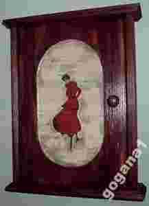 praktyczna drewniana szafka na klucze, ręcznie zdobiona motywem kobiety, z 6 haczykami na klucze