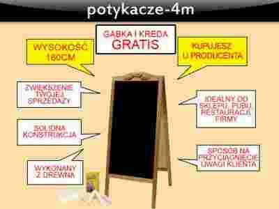 Przedmiotem aukcji jest potykacz reklamowy dwustronny, wykonany z drewna, w kolorze brązowym. Jest zabezpieczony przed rozłożeniem łańcuszkiem. Powierzchnia do pisania wykonana jest z płyty HDF. Po naszych potykacz można pisać kredą, lub specjalnymi markerami kredowymi, które również posiadamy w sprzedaży.