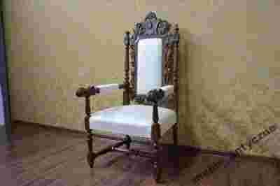 Antyczny fotel tron Eklektyczny. Wykonany z drewna dębowego, pięknie rzeźbionego, siedzisko na sprężynach, nowy materiał obiciowy, Fotel wygodny stabilny. Wiek ok 60lat.Brak śladów działalności szkodników. Fotel charakteryzuję się niebywałą elegancją. Stan Mebla bardzo dobry.