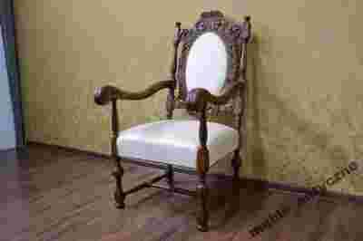 Antyczny fotel tron Eklektyczny. Wykonany z drewna dębowego, pięknie rzeźbionego, siedzisko na sprężynach, nowy materiał obiciowy, Fotel wygodny stabilny. Wiek ok 60lat.Brak śladów działalności szkodników. Fotel charakteryzuję się niebywałą elegancją. Stan Mebla idealny.