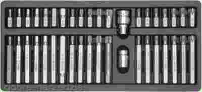 Profesjonalny zestaw bitów, służący do odkręcania śrub specjalnych typu: hex, torx, spline. Różnorodność bitów zapewnia możliwość wykonania wielu prac w specjalistycznych serwisach mechanicznych i samochodowych. Końcówki posiadają dwie długości 30 mm oraz 75 mm, mocowane w uchwycie sześciokątnym 10 mm, dostosowanym do współpracy z grzechotką 1/2" oraz 3/8".