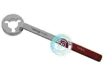 Klucz do pompy wodnej VM z klimatyzacją. Konstrukcja stal S45C; specjalistyczna główka klucza o obrysie koła z centralnym otworem o średnicy 30.5 mm oraz trzema gniazdami osadzonymi na krawędzi otworu co 120 stopni, główka przykręcona do pokrętła z odchyleniem 16 mm, które pozwala na blokowanie szerokiego koła klimatyzacji i pompy wodnej