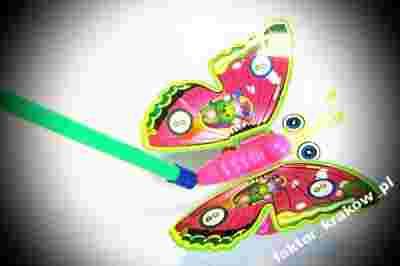 Plastikowy motyl zabawka, przeznaczony do zabawy dla dzieci powyżej 3 roku. Zabawka prowadzona po powierzchni, w prowadza w ruch skrzydła motyla, imitując jego lot. Posiada wygodną rączkę do prowadzenia.