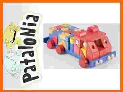 Auto składa się z drewnianej podstawy o wymiarze 45 x 20 x 20 cm oraz zestawu 43 drewnianych, różnokolorowych klocków w różnych kształtach.