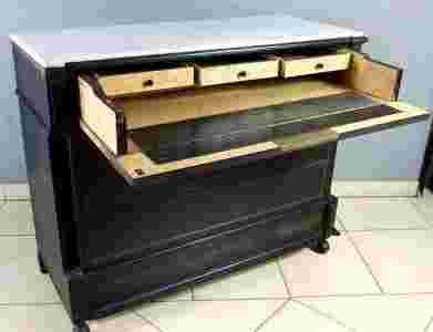 Jest to unikatowy cenny mebel pochodzący z końca XIX wieku. Wspaniała sylwetka została w charakterystyczny sposób dla stylu Napoleona III pomalowana na czarno. Komoda posiada 4 obszerne szuflady i znakomicie zaprojektowany pod blatem sekretarzyk z szufladkami. Wnętrze sekretarzyka oklejone ozdobnym fornirem klonu tzw. ptasie oczka. Blat wykonany z białego marmuru.