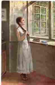 Zamyślona dziewczyna plecie warkocz- przedwojenna