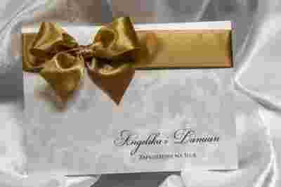 - Standardowo otrzymujecie Państwo gotowe, złożone zaproszenia, tasiemki oraz białe koperty. Oferujemy również wiązanie kokardek za dopłatą 0.10 zł./szt.