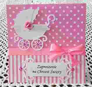 Oferowane zaproszenia wykonujemy z najwyższej jakości materiałów, precyzyjnie i z dbałością o najmniejszy szczegół. Niewątpliwym walorem jest ich przestrzenna forma, która wyróżnia nasz projekt elegancją i przełamuje powszechne, "płaskie" zaproszenia. Na jakże dziecięcym we wzorze i kolorach tle wyróżnia się dziecięcy wózeczek w stylu vintage. Nasz motyw wózeczka składa się z kilku pieczołowicie i precyzyjnie łączonych ze sobą elementów, co tworzy faktyczną jego trójwymiarowość - w przeciwieństwie do, dostępnych u innych, motywów z 1 arkusza papieru. Zdobiące nasz wózeczek różyczka i perełki nadają zaproszeniom delikatności, podobnie jak dopasowana kolorystycznie, satynowa wstążeczka. Bogato zdobny tag dopełnia całości, tworząc z pozostałymi elementami zaproszenia harmonijną kompozycję. Możemy umieścić na nim "Zaproszenie na Chrzest Święty" z imieniem dziecka lub bez lub inną podobną treść.